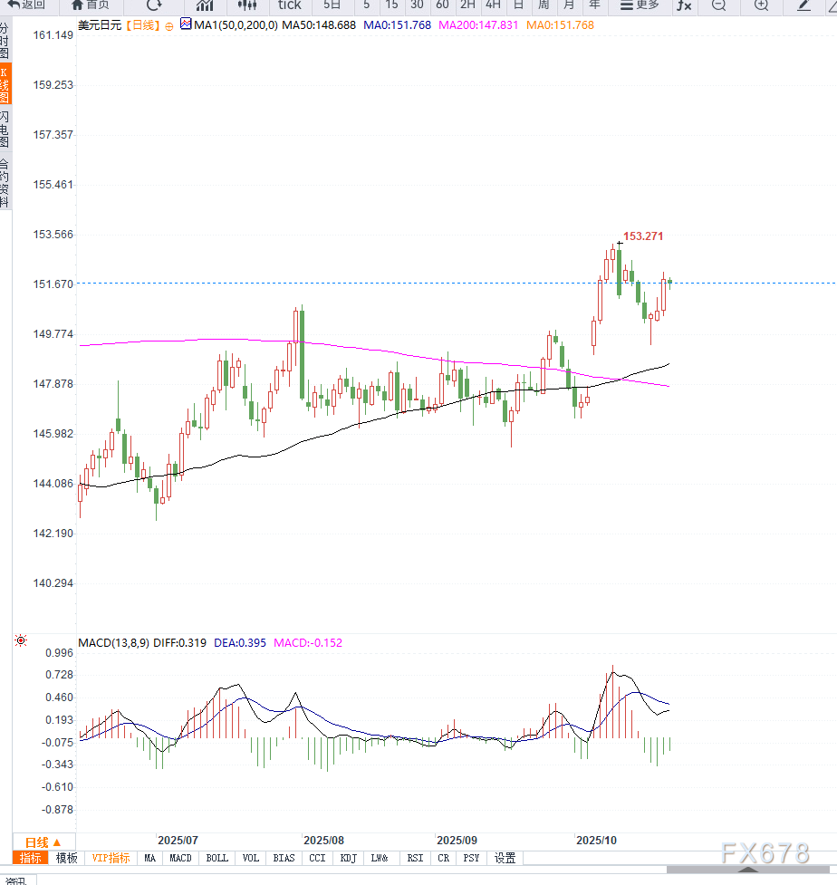 日本贸易数据推动日元走强。日本财务省公布数据显示,9月贸易赤字为2346亿日元,略低于8月的2428亿日元,但仍远低于市场预期的盈余220亿日元。 ![]() 机构观点:据市场调查显示,64/67位经济学家预计至2026年3月日本政策利率将维持在0.75%,其中约60%预期本季度加息25个基点。 美元承压于美国政府关门及政策不确定性。美国政府关门进入第四周,参议院多次未能通过拨款法案,经济数据发布受阻,投资者对美联储政策及美元前景的不确定性增加。 美联储基金期货显示,市场几乎完全定价10月降息25个基点,12月再降25个基点的可能性也高达98%。 专家观点:美联储圣路易斯联储行长Musalem表示,如就业风险上升且通胀可控,他支持进一步降息,并强调需采取平衡策略。联储主席Powell也指出,由于政府关门对经济数据影响,低速就业增长可能进一步削弱经济。 USD/JPY日线图显示,尽管短线下行至约151.70,但仍维持在上行通道内。上方初步阻力位在8个月高点153.27,进一步阻力关注通道上沿156.90。下方支撑位关注9日EMA的151.20, 若失守则可能测试通道下沿150.00及50日EMA 149.16,进一步下破可能引发看跌格局,探低至月度低点146.59。MACD短期显示偏弱,RSI回落至中性水平,短线震荡偏弱,但中期上行通道仍未破坏。 ![]() 日元短线因日本贸易数据改善及政治利好而走强,美元因政府关门及政策不确定性承压,导致USD/JPY回落。整体来看,汇价仍维持上行通道,中线多头趋势未改,但短线如失守关键支撑151.20,可能引发进一步调整。 |