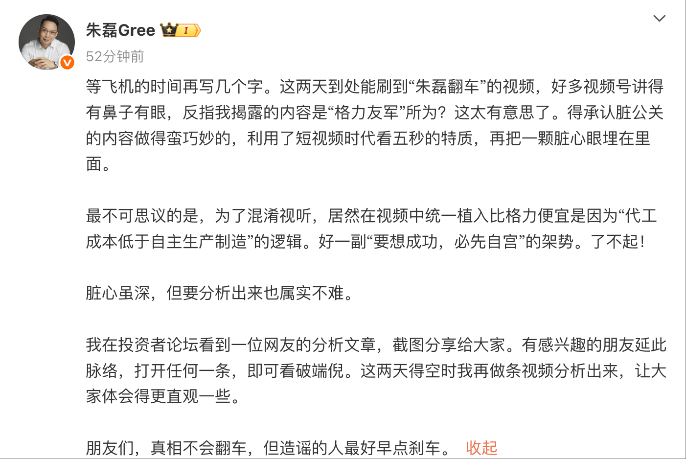 凤凰网科技讯 10月22日,珠海格力电器股份有限公司市场总监朱磊发文称:这两天到处能刷到“朱磊翻车”的视频,好多视频号讲得有鼻子有眼,反指我揭露的内容是“格力友军”所为?这太有意思了。得承认脏公关的内容做得蛮巧妙的,利用了短视频时代看五秒的特质,再把一颗脏心眼埋在里面。
