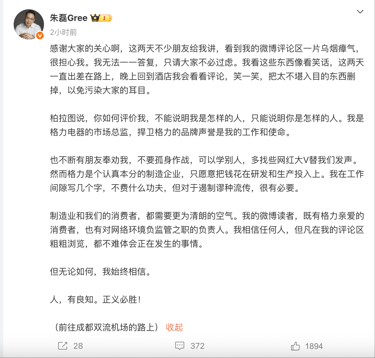 稍早前,朱磊发文称,格力是个认真本分的制造企业,只愿意把钱花在研发和生产投入上。