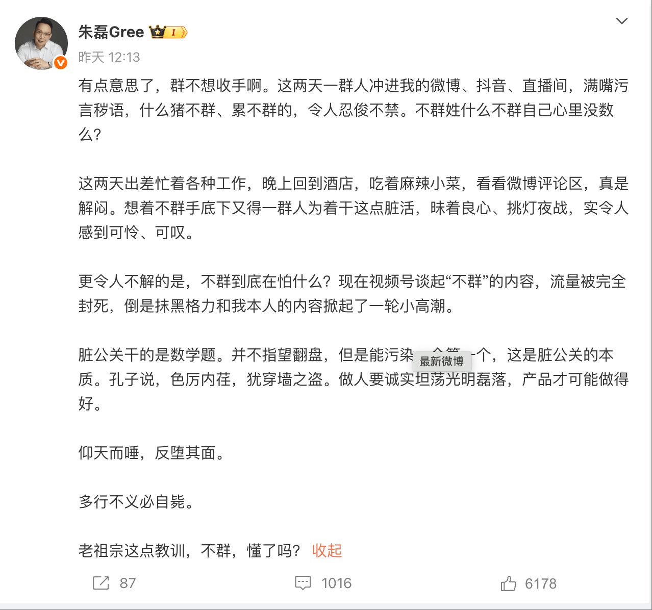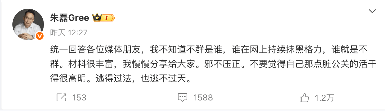 据媒体报道,10月21日,朱磊连发两条博文,就近期格力被“水军攻击“一事再次发声。朱磊称,不知道不群是谁,持续抹黑格力的就是“不群”,会慢慢分享相关材料,坚信邪不压正,脏公关的行为瞒不过去。 朱磊口中的“不群”,疑似再次暗指小米雷军。