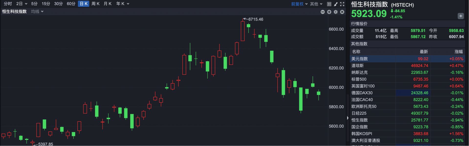 恒生科技指数报收于5923.09点,下跌84.85点,跌幅1.41%。