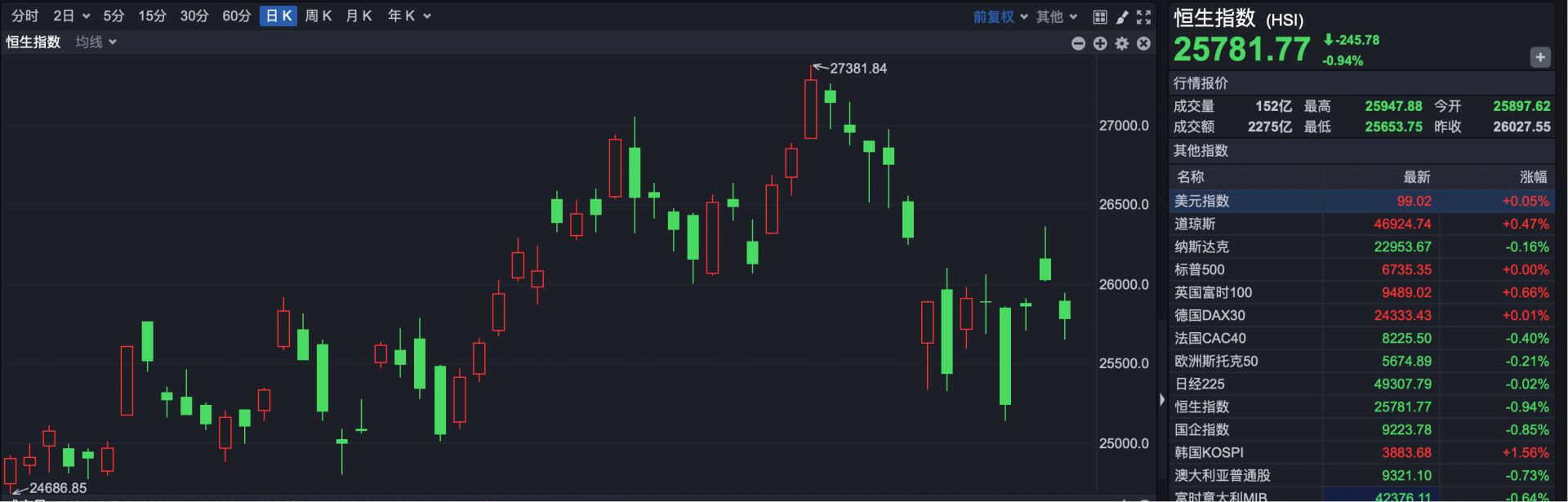 每经记者|曾子建 每经编辑|袁东 今日(10月22日),港股市场全天表现低迷。 截至收盘,恒指报收于25781.77点,下跌245.78点,跌幅0.94%。