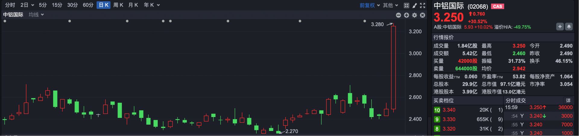 焦点公司方面,中铝国际(601068.SH)A股涨停,带动H股午后飙升,最终收盘大涨30%。