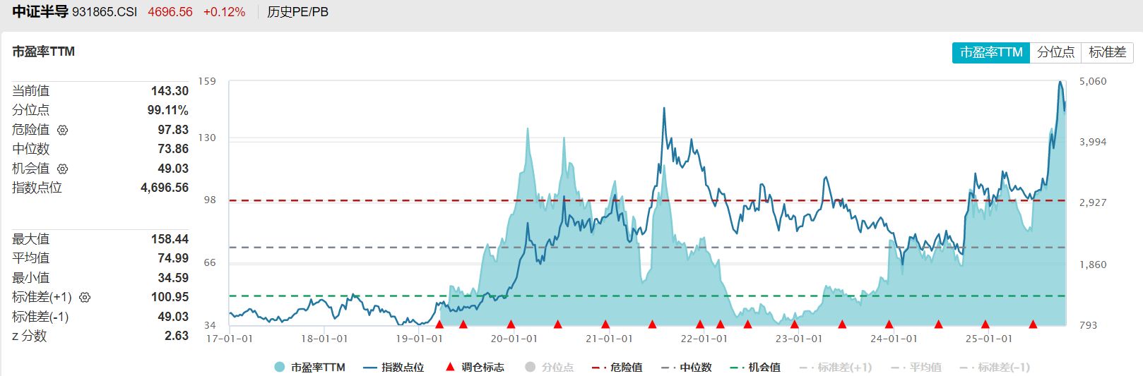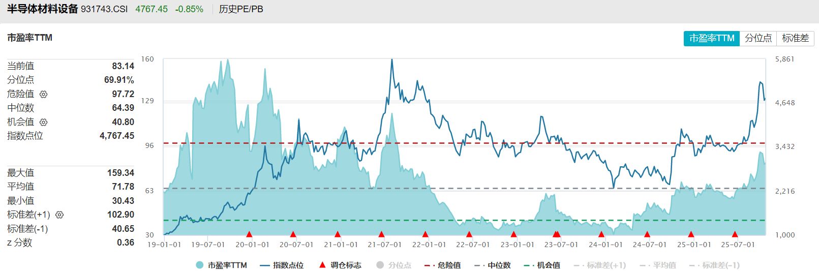 继续对比两个指数的估值水平,Wind数据显示,中证半导体材料设备主题指数目前的市盈率TTM已经回升到了历史70%左右分位,而中证半导体产业指数目前的市盈率TTM已经回升到了历史90%以上分位。