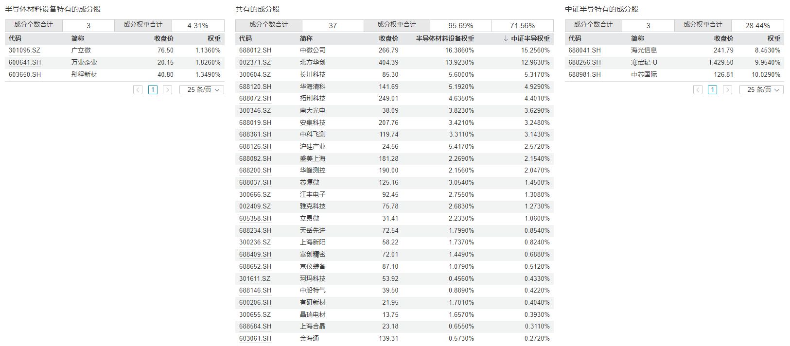 进一步对比两个指数的成分股可以发现,两个指数重合的成分股数量是37只,各自独有的成分股均为3只。其中,中证半导体产业指数中独有的3只成分股为寒武纪-U、中芯国际、海光信息。