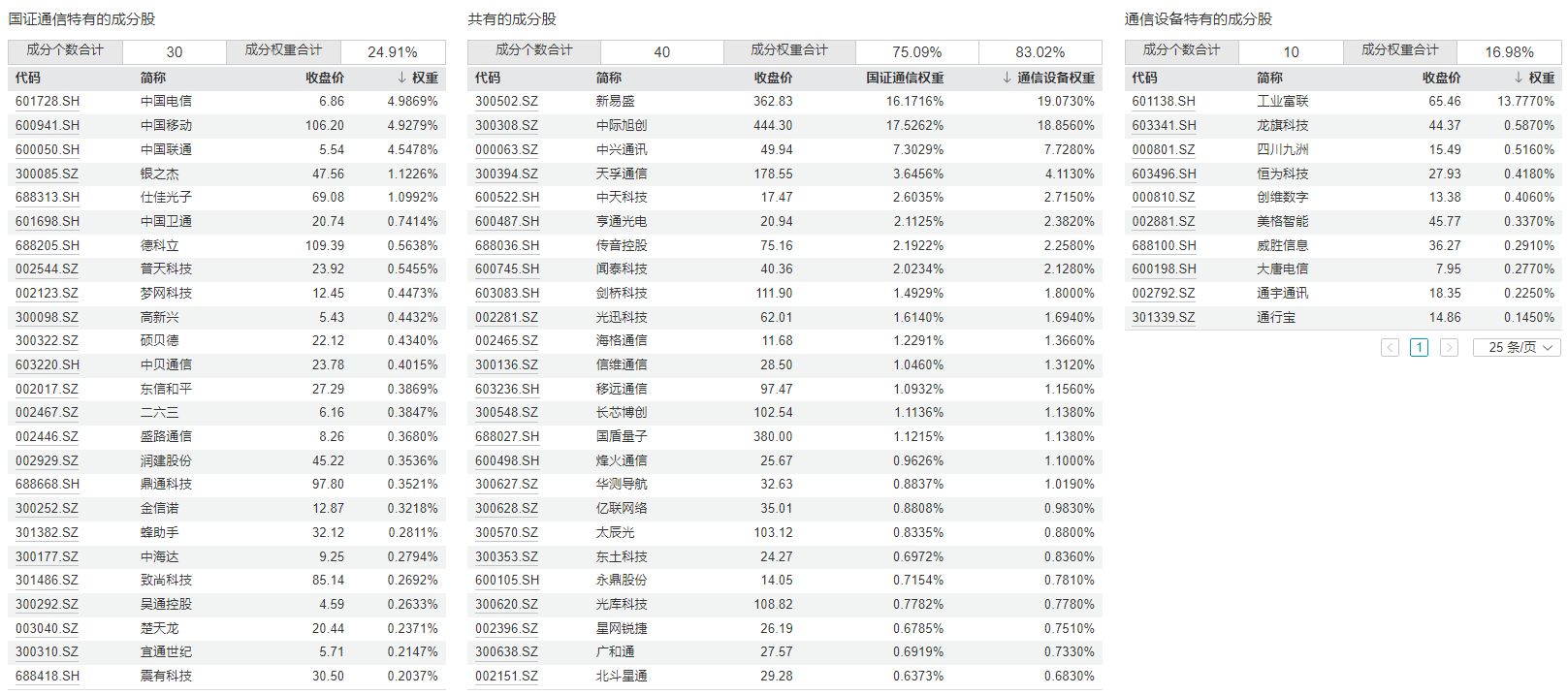 进一步对比两个指数可以发现,两个指数重合的成分股数量是40只,国证通信指数独有的成分股数量是30只,中证全指通信设备指数独有的成分股数量是10只。