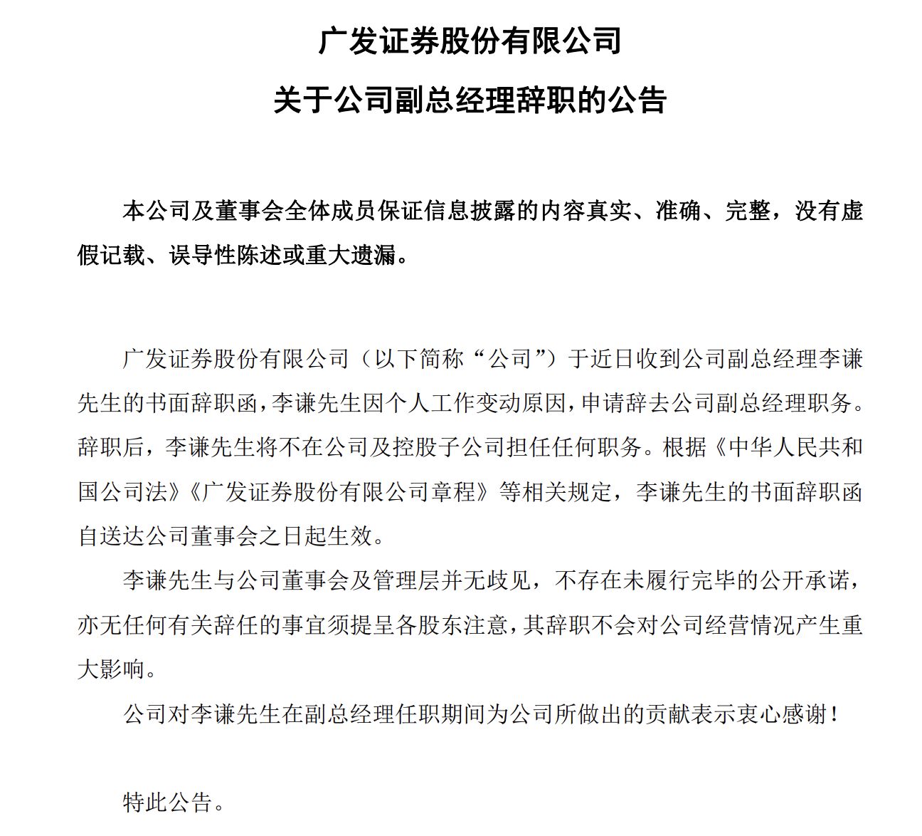 每经记者|陈晨 每经编辑|肖芮冬 在辞别广发证券一周后,业内资深高管李谦的去向终于尘埃落定。 10月22日,《每日经济新闻》记者获悉,广发证券原副总经理李谦将加盟平安证券,出任该公司总经理(拟任)。这一备受市场关注的人事变动,不仅为平安证券的高管团队再添一员“实力派”干将,更被视为其“外引内升”人才战略的又一重要落子。 李谦加盟平安证券,拟任总经理券商行业的高管流动向来是市场关注的焦点。10月15日晚间,广发证券发布公告称,李谦因个人工作变动原因,申请辞去公司副总经理职务,辞职后将不在公司及控股子公司担任任何职务。公告一出,便有市场消息称,李谦将前往某大型券商担任总经理。