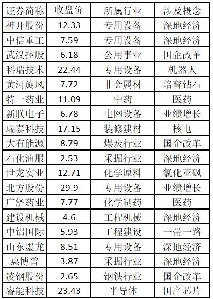 (注:概念涨停板个股越多,说明该概念被资金重点关注,是当前热门概念。) 二、涨停个股榜单 从涨势强度来看,涨停板个股中,股价创出历史新高的个股共有0只。欢迎大家关注微信公众号“道达号”,其“道达涨停复盘”栏目为大家解读。 涨停板个股中,股价创出近一年新高的个股有19只(不包括创出历史新高的个股),包括神开股份、中信重工、武汉控股、科瑞技术、黄河旋风、特一药业、新联电子、瑞泰科技、大有能源、石化油服、世龙实业、北方股份、广济药业、建设机械、中铝国际、山东墨龙、惠博普、凌钢股份、睿能科技,具体如下表所示。