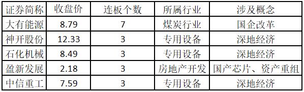 (注:封板资金越多的个股,说明该股被资金追捧,其延续上涨概率较大。) 从连板情况来看,今日首板个股有35只;2连板的个股有14只;3连板及以上的个股有7只。今日连板数排名前5的个股包括大有能源、神开股份、石化机械、盈新发展、中信重工,具体如下表所示。