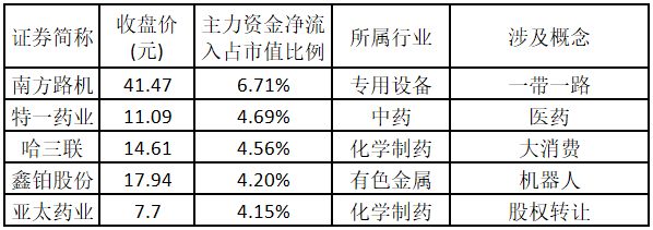 (注:主力资金净流入金额越多的涨停股,说明该股被主力资金重点关注,值得重点关注。) 主力资金净流入金额占市值比例排名前5的个股分别为南方路机、特一药业、哈三联、鑫铂股份、亚太药业。欢迎大家关注微信公众号“道达号”,其“道达涨停复盘”栏目为大家解读。