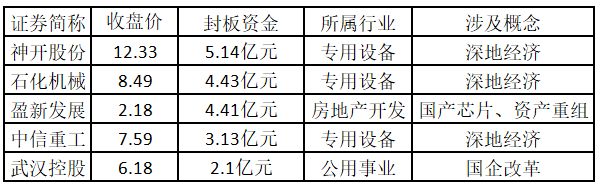 (注:主力资金净流入金额占市值比例越高的个股,说明该股被主力资金重点关注,值得重点关注。) 从封板资金来看,今日涨停板个股中,封板资金排名前5的个股包括神开股份、石化机械、盈新发展、中信重工、武汉控股。