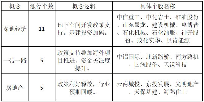 (注:行业涨停板个股越多,说明该行业被资金重点关注,是当前热门行业。) 从概念特征来看,今日涨停板个股中,深地经济、“一带一路”、房地产概念的个股最多。