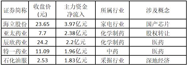 (注:创出近一年新高的涨停股,说明该股走出重要突破行情,值得重点关注。) 从主力资金来看,今日涨停板个股中,主力资金净流入金额排名前5的个股分别为海立股份、亚太药业、辰欣药业、特一药业、石化油服。