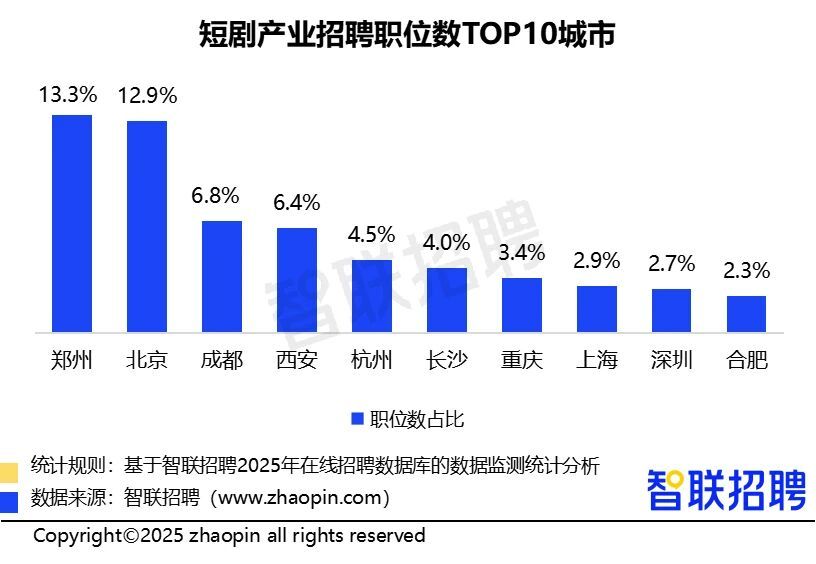每经记者|杨弃非 每经编辑|刘艳美 越来越多的传统影视行业“大佬”正挤进短剧赛道。 10月22日,中国电影(600977.SH)在投资者互动平台回答投资者提问时表示,中影制片厂承接短剧拍摄项目。前一天,华谊兄弟(300027.SZ)也透露,公司正式创建短剧厂牌“华谊兄弟火剧”。 近段时间以来,百度、抖音、美团、京东、小米等互联网巨头亦纷纷布局,争夺下一个“风口”。 数据显示,2024年全国短剧市场规模达505亿元,首次超过全年电影票房。浪潮之下,诸多城市也看到机会,争相竞逐“短剧之都”。 其中话题度最高的,当属郑州。 DataEye剧查查近期发布《2025中国微短剧产业综合实力城市报告》,郑州排名全国第二,仅次于北京;根据智联招聘发布的今年前三季度短剧行业人才需求,郑州更以13.3%的职位数占比位居城市榜首,三季度需求更大涨75.6%。
