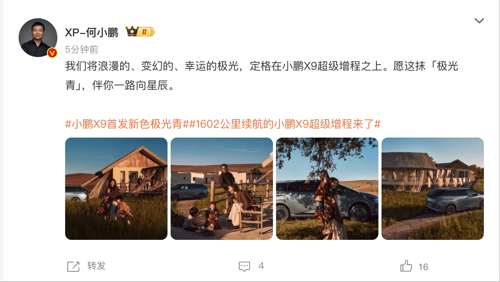 凤凰网科技讯 10月23日,小鹏汽车董事长何小鹏发文宣布,小鹏X9超级增程首发新色极光青。