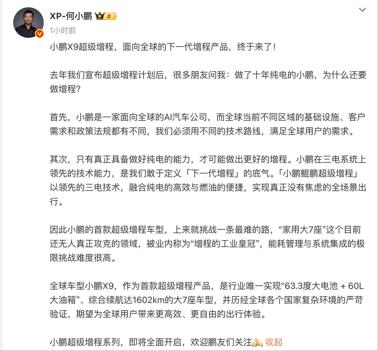 稍早前,何小鹏发文称,小鹏X9超级增程,面向全球的下一代增程产品,终于来了。 文中何小鹏回答了为什么要做增程?他表示,一是必须用不同的技术路线,满足全球用户的需求。二是只有真正具备做好纯电的能力,才可能做出更好的增程。 据何小鹏介绍,小鹏X9超级增程是行业唯一实现“63.3度大电池+60L大油箱”、综合续航达1602km的大7座车型。