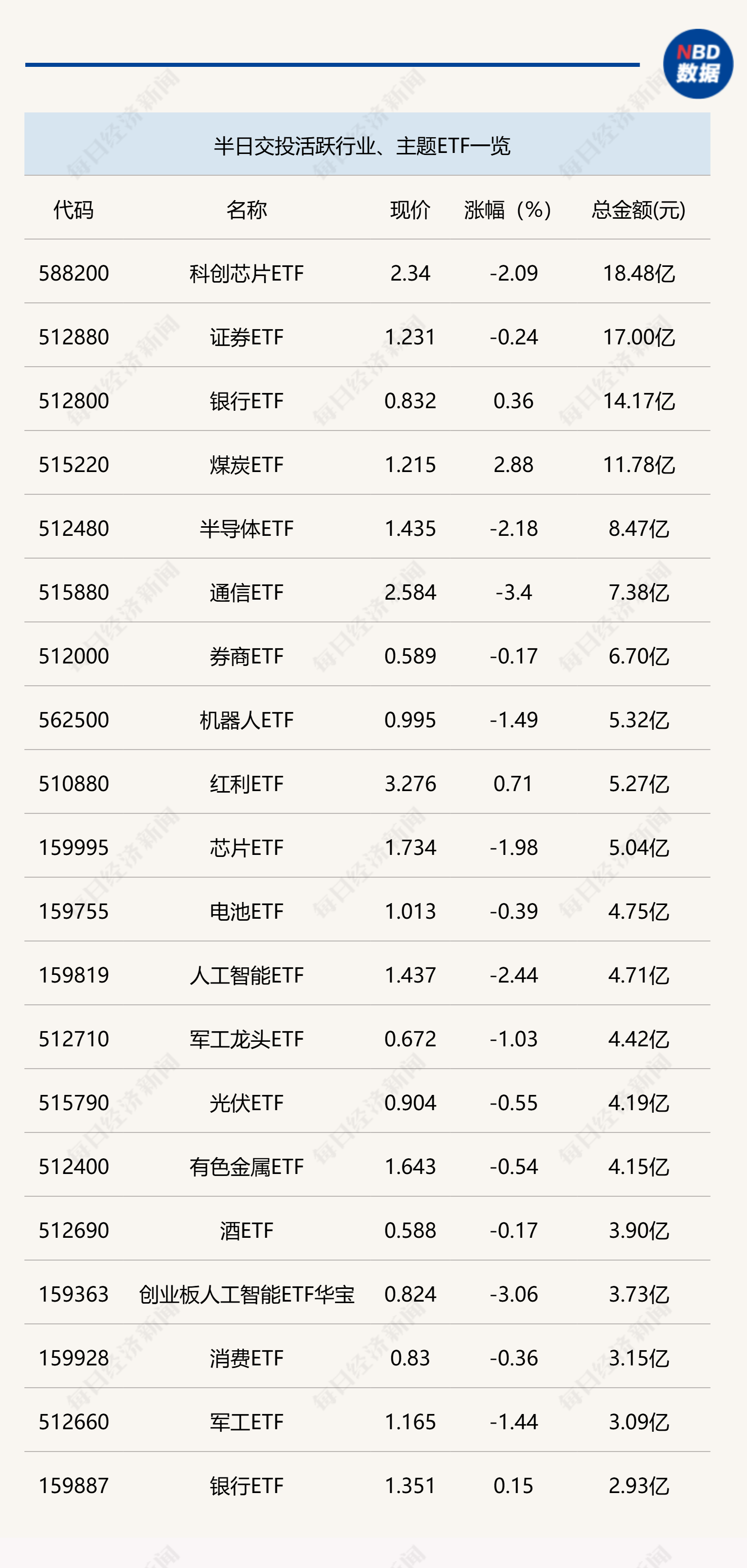 每经记者|刘明涛 每经编辑|叶峰 今日上午,科技类ETF整体交易活跃,科创芯片ETF(588200)、半导体ETF(512480)以及芯片ETF(159995)半日成交金额均超过5亿元,而在跨境ETF方面,除了香港证券ETF(513090)成交保持高度活跃外,两只恒生科技相关ETF半日成交金额超过30亿元。