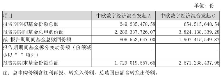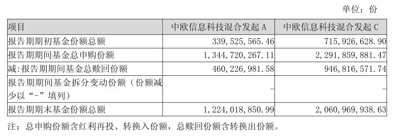 基金经理在三季报中还对持仓的变化做了进一步的说明:1.小幅减仓AI基础设施:长期增长逻辑依然稳固,前期积累涨幅较大,基金保持谨慎乐观态度,适当减仓;2.增配智能机器人:海外头部企业量产逐渐落地;3.优化AI应用组合:从B端应用公司更多转向C端互联网平台公司;4.增配端侧AI:端侧陆续落地AI功能,催生新一轮硬件换机潮和软件生态创新。 同时,基金经理表示:“经过前期较大幅度的上涨,AI板块整体估值已不再处于低位区间,部分热门概念股的估值甚至包含了对未来多年高速成长的乐观预期。当前投资机遇与风险并存,机遇在于AI技术正处于加速迭代和商业化落地的黎明期,产业天花板极高。但风险在于,高估值意味着对业绩兑现的要求更为苛刻,也更容易受到市场情绪、流动性及宏观因素变化的冲击,板块波动性会显著加大。” 多只基金三季度规模大增除了这只基金,中欧基金旗下的多只产品今日也披露了三季报,记者注意到,多只基金在三季度同样有明显的规模变化。 比如中欧信息科技混合,A类份额在三季度申购超过13亿份,C类申购更是接近23亿份,累计份额从期初的10.55亿份大增到期末的32.85亿份。
