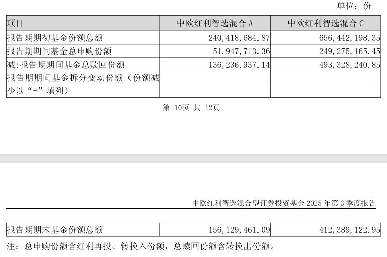 当然,也有的基金三季度处于净赎回的状态,比如聚焦红利主题的中欧红利智选混合,A类和C类份额在三季度都有比较明显的净赎回。