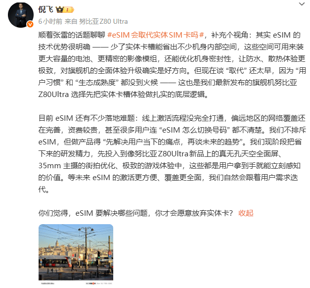 凤凰网科技讯 10月23日,努比亚总裁倪飞今日通过微博发声,围绕“eSIM会取代实体SIM卡吗”这一热点话题给出明确观点:eSIM的技术价值值得肯定,但当下谈“取代”为时尚早,努比亚选择先聚焦用户当下可感知的核心体验升级。