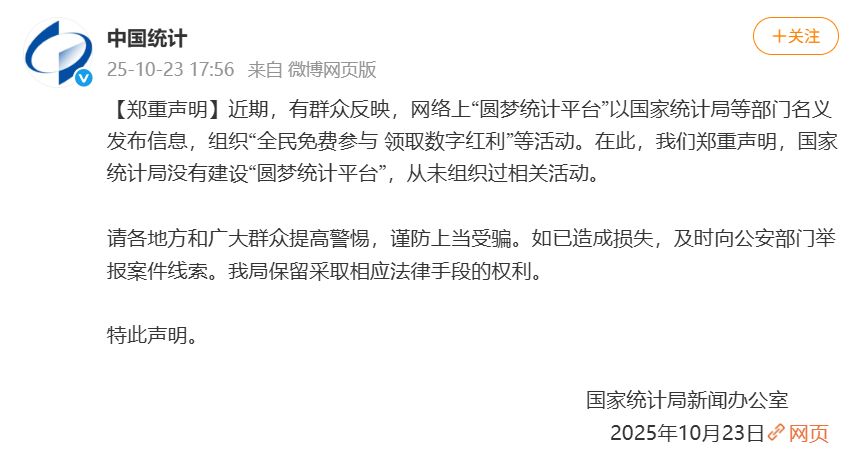 10月23日,国家统计局发布郑重声明:近期,有群众反映,网络上“圆梦统计平台”以国家统计局等部门名义发布信息,组织“全民免费参与 领取数字红利”等活动。在此,国家统计局郑重声明,国家统计局没有建设“圆梦统计平台”,从未组织过相关活动。