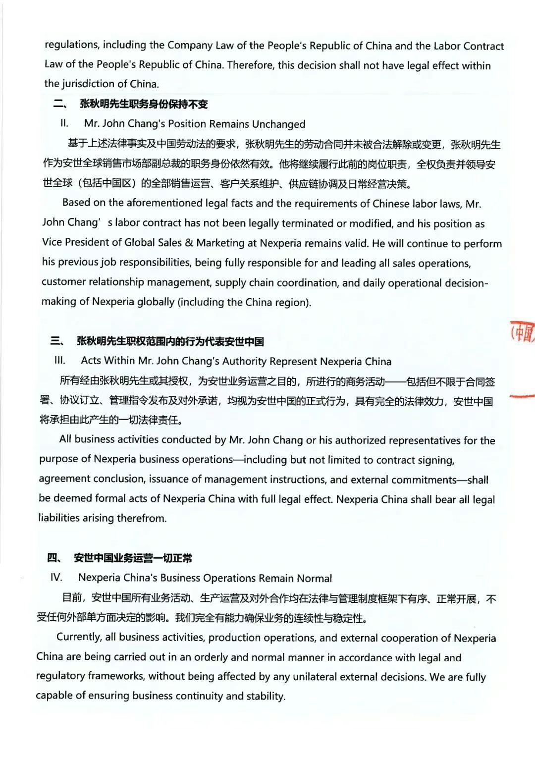 每经编辑|张锦河 10月23日,安世半导体(中国)有限公司官微发布关于安世半导体全球销售与市场副总裁张秋明先生任职效力的郑重声明。 其中提到,为确保安世半导体在全球以及中国市场的业务连续性与管理稳定性,依照中华人民共和国相关法律法规及行政指导精神,安世半导体(中国)有限公司(下称“安世中国”)现就近期荷兰总部单方面免去张秋明先生销售市场部副总裁职务一事,发表如下正式声明: 一、荷兰总部相关决定在中国境内不具备法律效力; 二、张秋明职务身份保持不变; 三、张秋明先生职权范围内的行为代表安世中国; 四、安世中国业务运营一切正常,目前,安世中国所有业务活动、生产运营及对外合作均在法律与管理制度框架下有序、正常开展,不受任何外部单方面决定的影响。我们完全有能力确保业务的连续性与稳定性。