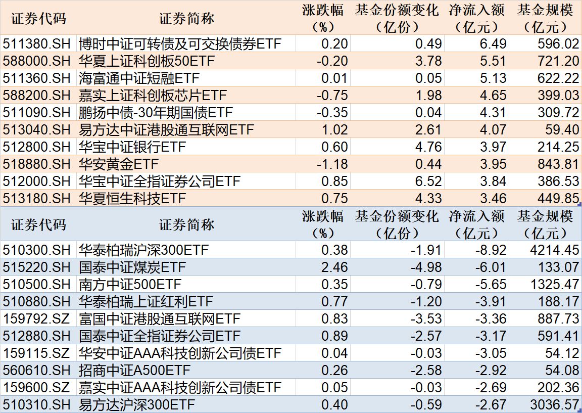 每经记者|叶峰 每经编辑|肖芮冬 昨日市场探底回升,三大指数全线收红。从板块来看,深圳本地股全天领涨,煤炭板块集体拉升,锂矿概念股午后走强;下跌方面,工程机械板块走弱。 Wind数据显示,在10月23日非货币ETF市场中,博时中证可转债及可交换债券ETF基金份额增加0.49亿份,净流入额为6.49亿元;华夏上证科创板50ETF基金份额增加3.78亿份,净流入额为5.51亿元;海富通中证短融ETF基金份额增加0.05亿份,净流入额为5.13亿元。