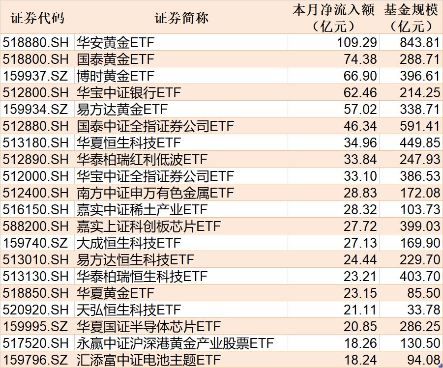 与此同时,华泰柏瑞沪深300ETF基金份额减少1.91亿份,净流出额为8.92亿元;国泰中证煤炭ETF基金份额减少4.98亿份,净流出额为6.01亿元;南方中证500ETF基金份额减少0.79亿份,净流出额为5.65亿元。 截至10月23日,本月资金净流入额居前20的ETF名单如下: