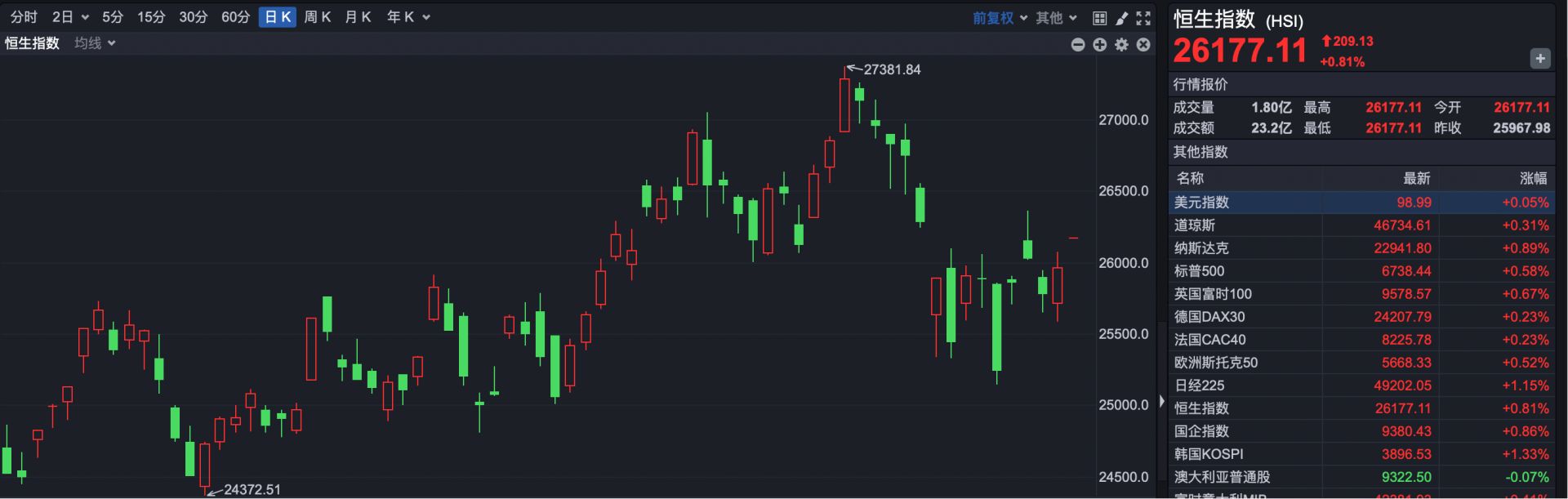 每经记者|曾子建 每经编辑|袁东 今日(10月24日)早盘,港股市场小幅低开。 截至发稿,恒生指数报26177点,上涨209点,涨幅0.81%。