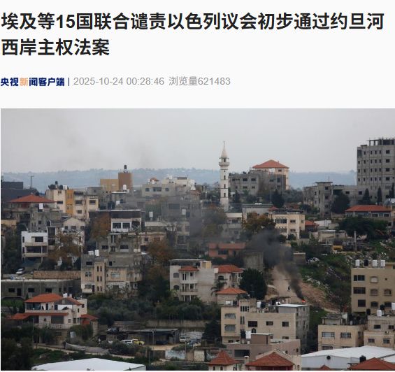 每经编辑|杜宇 据央视新闻10月24日消息,当地时间10月23日,埃及、约旦、卡塔尔、沙特、巴基斯坦、印尼等15国和阿拉伯国家联盟、伊斯兰合作组织发表联合声明,强烈谴责以色列议会批准的两项旨在将以色列主权扩展至约旦河西岸和非法定居点的法律草案。
