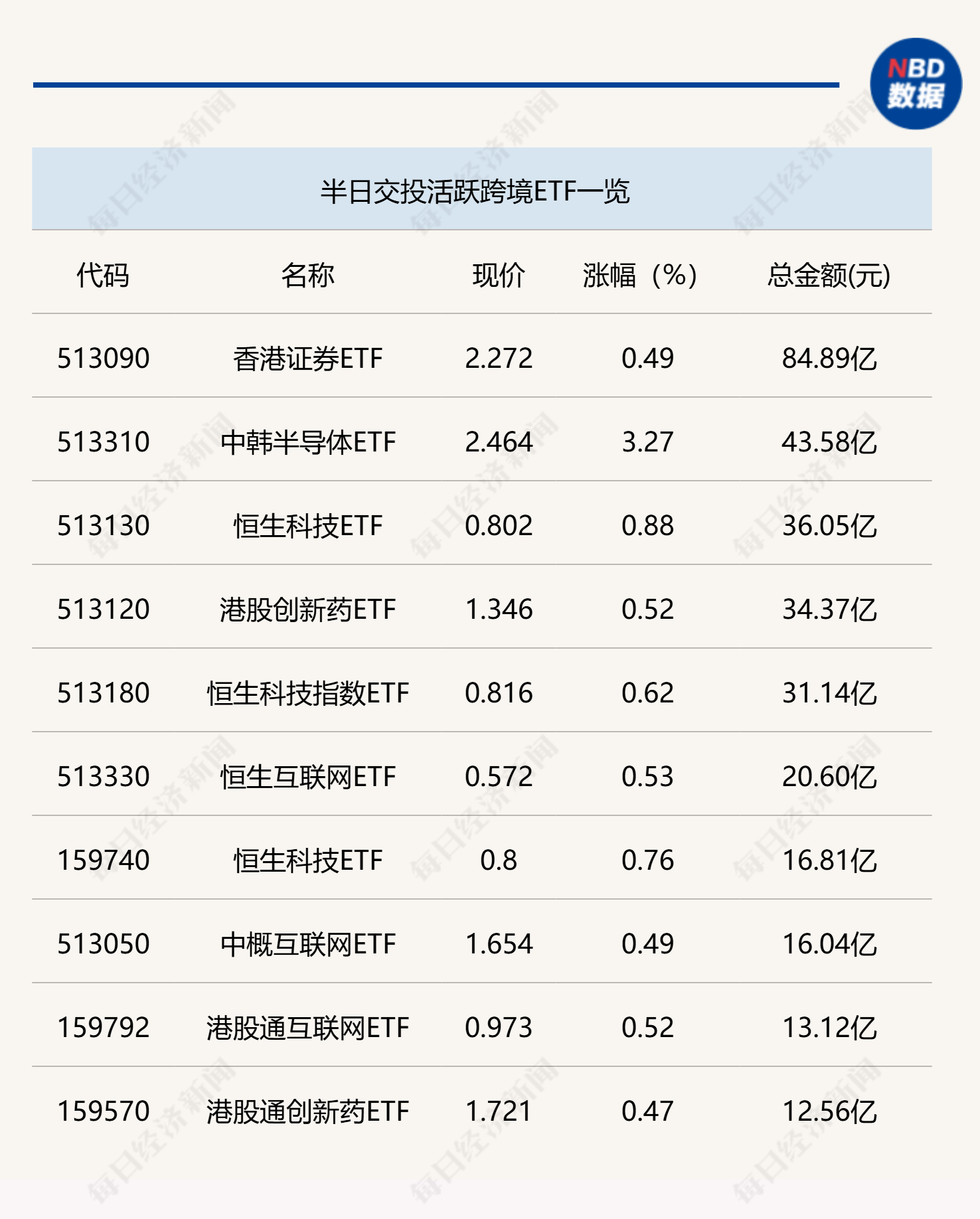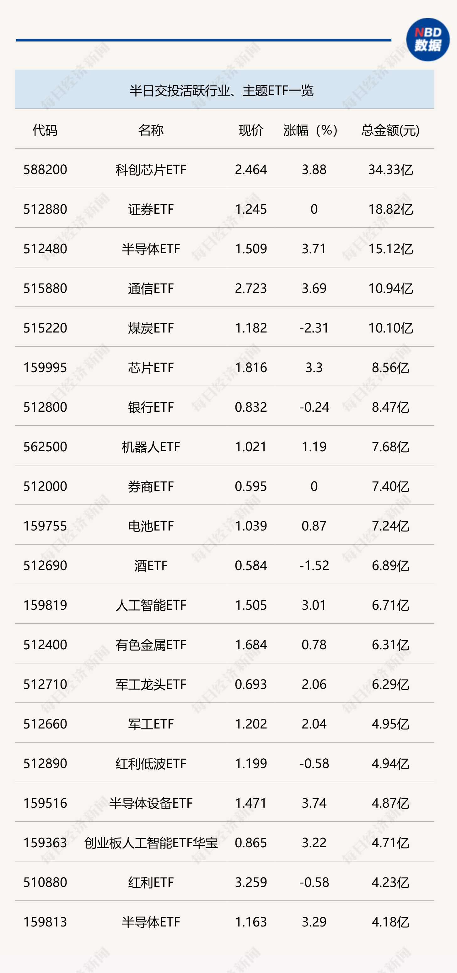 每经记者|刘明涛 每经编辑|叶峰 今日上午,科创芯片ETF(588200)成交金额高达34.33亿元,较前一交易日大幅放量,而半导体ETF(512480)和芯片ETF(159995)半日成交金额也在10亿元左右,交投活跃。跨境类ETF方面,香港证券ETF(513090)半日成交近百亿,中韩半导体ETF(513310)成交也高达43.58亿元。