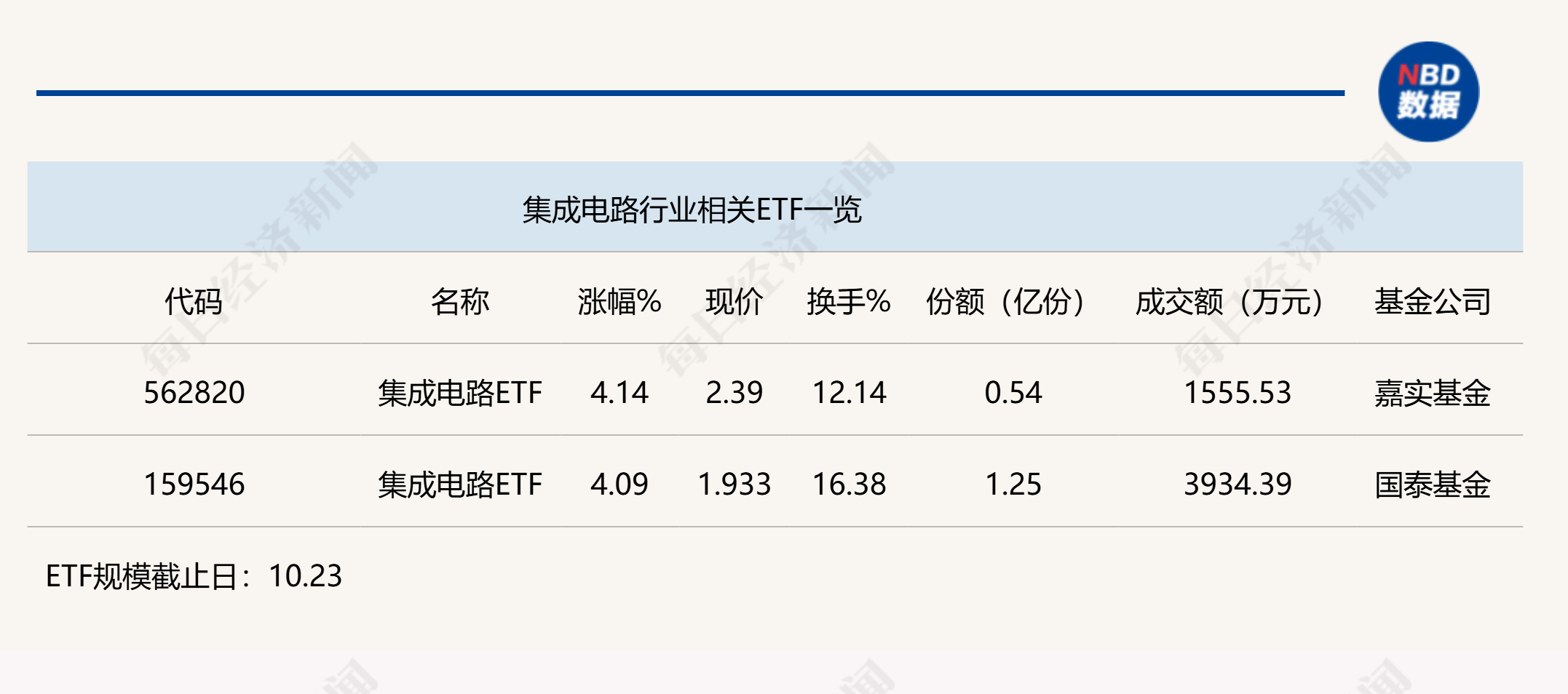 ETF涨幅榜上,整个半导体芯片相关ETF均实现大涨,平均涨幅在3.5%左右,其中,两只集成电路ETF表现最佳,涨幅均在4%以上。