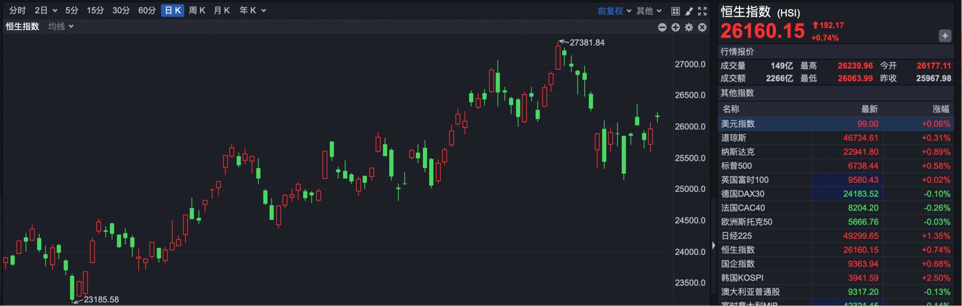 每经记者|曾子建 每经编辑|袁东 今日(10月24日),港股市场连续第二天反弹。 截至收盘,恒指报收于26166.03点,上涨198.05点,涨幅0.74%。