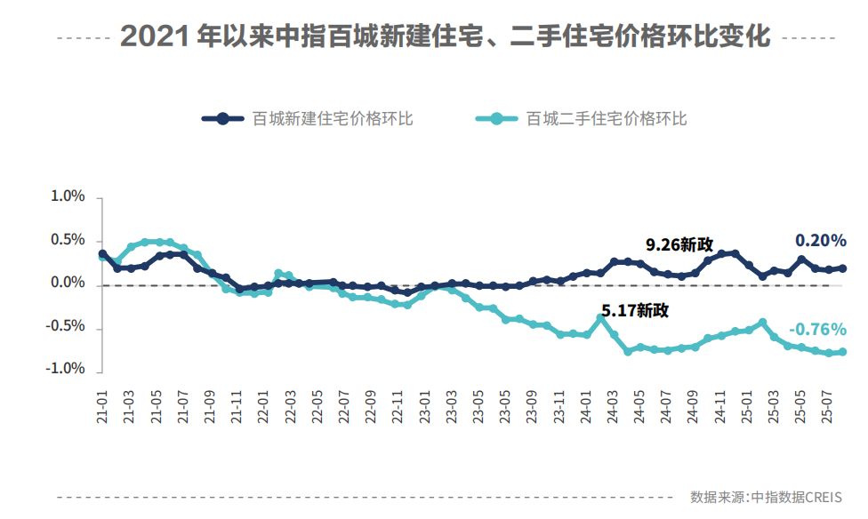 政策效应在市场端逐步显现但动能趋弱。国家统计局数据显示,2025年1~9月,全国新建商品房销售面积6.58亿平方米,同比下降5.5%,降幅较去年同期收窄11.6个百分点;销售额6.3万亿元,同比下降7.9%,核心指标虽仍处负区间但改善趋势明确。 相较于新房市场,二手房市场表现更显韧性。中指研究院监测显示,重点30城1~7月二手房成交套数同比增长10%,尤其是到7月,二手房成交占比已升至68%,创下近年新高。 如前所述,“十四五”期间,全国累计销售新建商品住宅面积约50亿平方米。同时,存量住房市场的规模持续扩大,目前全国有15个省、区、市二手住宅交易量超过新房。 需要指出的是,2023年以来,新房价格在核心城市改善项目入市带动下,环比结构性上涨,二手房成交量尽管在持续上涨,价格却呈现持续下滑态势。中指百城价格指数显示,二手房价格已连续41个月环比下跌。