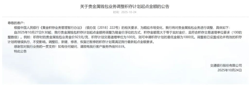 每经编辑|毕陆名 10月24日,交通银行发布公告称,为顺应市场变化,自10月27日9:30起,该行贵金属钱包积存计划起点金额将调整为随金价浮动的方式,积存金额需大于等于实时金价,且符合积存交易递增单位要求(100的整数倍)。