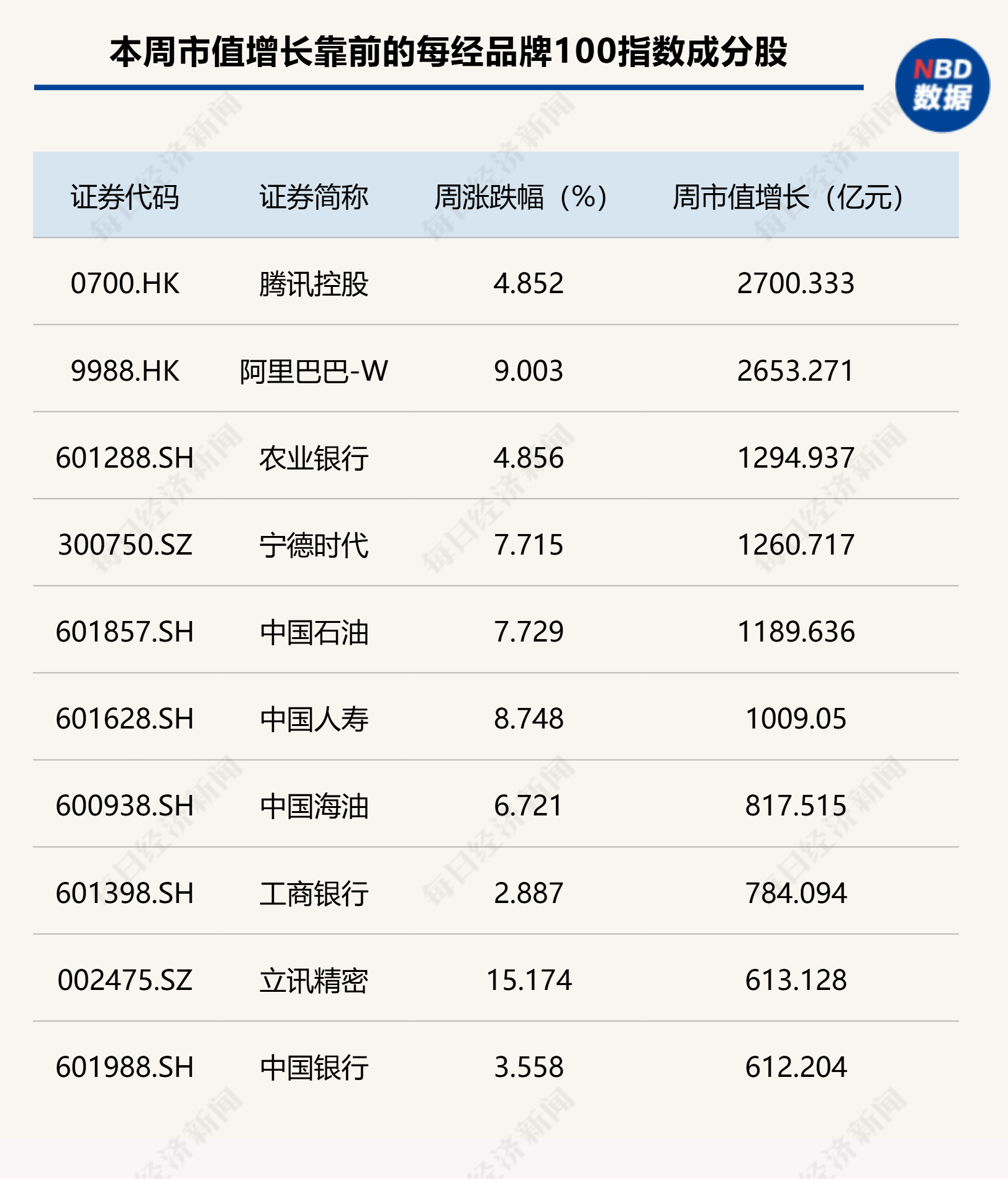 成分股方面,本周每经品牌100指数成分股超七成实现上涨。其中,立讯精密周涨幅高达15.17%,表现最强;阿里巴巴-W、中国人寿、中国石油以及宁德时代周涨幅也超过7%。 在市值增长方面,腾讯控股和阿里巴巴-W周市值增长分别达到2700.33亿元和2653.27亿元,周市值增长较大,农业银行、宁德时代、中国石油以及中国人寿周市值增长也超过千亿元。