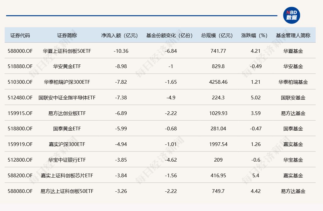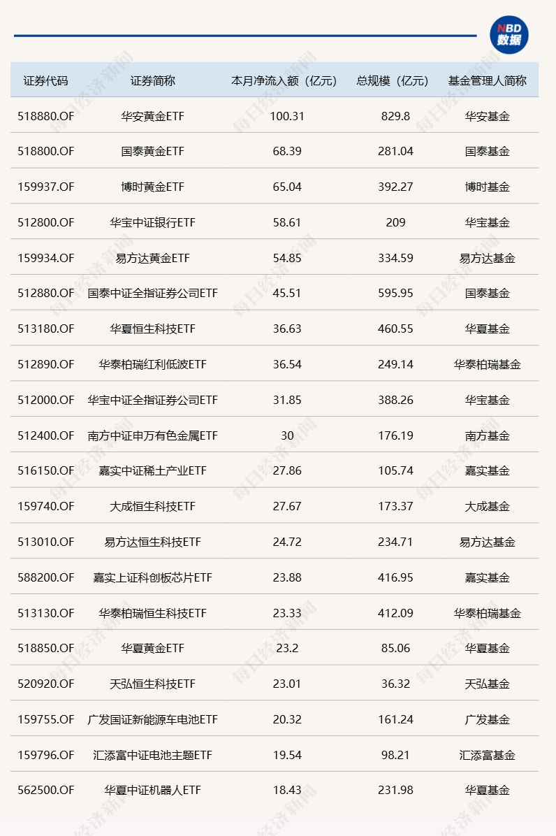 与此同时,华夏上证科创板50ETF基金份额减少6.84亿份,净流出额为10.36亿元;华安黄金ETF基金份额减少1.00亿份,净流出额为8.98亿元;华泰柏瑞沪深300ETF基金份额减少1.65亿份,净流出额为7.82亿元。 截至10月24日,本月资金净流入额居前20的ETF名单如下:
