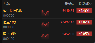 10月27日消息,港股三大指数集体上涨。截至午间收盘,恒生指数涨1.02%,报26427.16点,恒生科技指数涨1.48%,国企指数涨0.95%。盘面上,科网股涨多跌少,百度涨超5%,阿里巴巴涨超3%,京东、腾讯涨超2%,美团、哔哩哔哩、快手涨超1%,小米跌超2%;加密货币概念股普涨,新火科技控股涨超11%;核电股涨幅居前,中广核新能源涨超3%;中资券商股活跃,招商证券涨超3%。