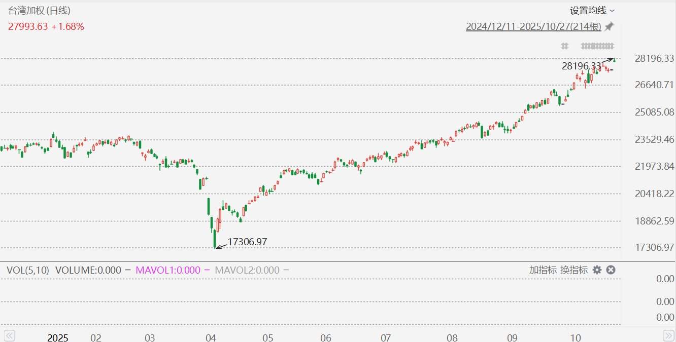 格隆汇10月27日|台湾加权指数收盘上涨461.37点,涨幅1.68%,报27993.63点,创收盘历史新高,年内累涨21.53%。