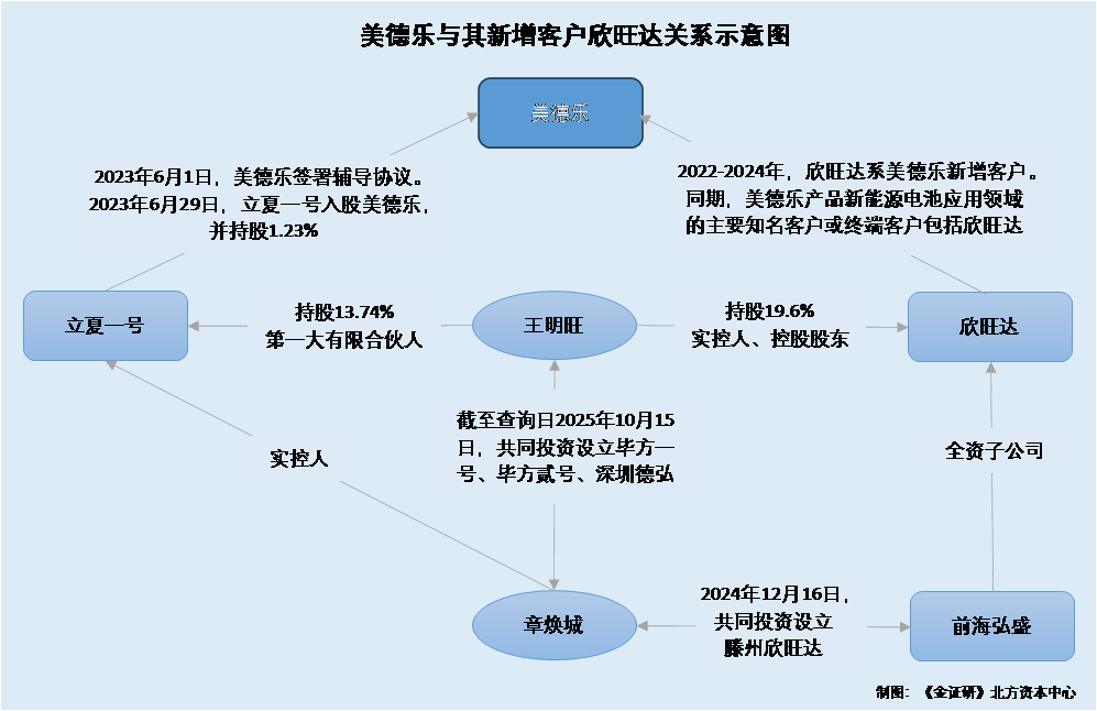 《金证研》北方资本中心 乐之DL/作者 廉贞/风控 2025年10月9日,北京证券交易所(以下简称“北交所”)正式启用独立的“920”证券代码号段,市场整体实现证券代码的统一与升级。在此背景下,大连美德乐工业自动化股份有限公司(以下简称“美德乐”)也是“排队”申报北交所的一员。 签订上市辅导当月,即2023年6月,成立于2023年2月的私募基金或“突击”入股美德乐。值得注意是,该私募基金的第一大有限合伙人王明旺,或系上市企业欣旺达(300207)的实控人兼控股股东。而报告期内即2022-2024年,欣旺达成为美德乐的新增客户。另一方面,美德乐披露的销售数据或与客户披露的采购额“对不上”,且其聘请的审计机构频因执业问题被“点名”。 一、上市辅导当月私募股东“突击”入股,且该私募的有限合伙人或为美德乐新增客户实控人 抽丝剥茧方能了解事情真相。美德乐签署辅导协议当月,一家私募基金入股美德乐,深入研究发现,该私募基金的第一大有限合伙人,或系美德乐报告期内新增客户的实控人。 1.1 2023年6月签署上市辅导协议,同月私募股东立夏一号入股并持股1.23% 据美德乐保荐机构签署于2023年6月1日的《关于美德乐首次公开发行股票并上市辅导备案报告》,2023年6月1日,美德乐与国泰海通证券(600837)股份有限公司签署上市辅导协议。 据美德乐签署于2024年5月10日的《北京德恒律师事务所关于美德乐申请股票在全国中小企业股份转让系统挂牌并公开转让的法律意见》(以下简称“签署于2024年5月10日的法律意见”),2023年6月29日,美德乐注册资本由5,509.03万元增资至5,612.33万元,其中68.86万元出资由私募基金深圳市立夏一号创业投资合伙企业(有限合伙)(以下简称“立夏一号”)以货币方式认缴,34.43万元出资由宁波鼎祥名仕创业投资合伙企业(有限合伙)(以下简称“鼎祥名仕”)以货币方式认缴。本次增资的价格为29.04元/股。 据美德乐签署于2025年5月23日的招股说明书(以下简称“签署于2025年5月23日的招股书”),截至签署日,立夏一号、鼎祥名仕分别持有美德乐1.23%、0.89%的股份。 即美德乐签订上市辅导协议同月即2023年6月,立夏一号、鼎祥名仕入股美德乐。 值得关注的是,王明旺系立夏一号的有限合伙人之一。 1.2立夏一号第一大有限合伙人王明旺持股13.74%,章焕城为立夏一号基金管理人德弘联信的实控人 据签署于2024年5月10日的法律意见,立夏一号成立于2023年2月8日,执行事务合伙人为深圳市德弘联信私募股权基金管理有限公司(以下简称“德弘联信”)。截至法律意见出具日2024年5月15日,王明旺对立夏一号的出资比例为13.74%,为立夏一号第一大有限合伙人。 据市场监督管理局数据,截至查询日2025年10月24日,王明旺对立夏一号的出资比例为13.74%。 此外,德弘联信成立于2014年11月12日。截至查询日2025年10月24日,德弘联信的法定代表人系章焕城,德弘联信的股东系刘军辉、姚高升、章焕城。2024年3月21日,德弘联信发生投资额变更。变更前,章焕城、刘军辉、姚高升、李焯荣分别持股24.5%、24.5%、2%、49%。变更后,章焕城、刘军辉、姚高升分别持股73.5%、24.5%、2%。 据基金证券业协会公开信息,截至查询日2025年10月24日,德弘联信的实际控制人为章焕城。 关于王明旺的背景或值得关注。 1.3 欣旺达为美德乐2022-2024年新增客户,其实控人也名为“王明旺” 需要指出的是,同名的“王明旺”,名下的企业包括欣旺达电子股份有限公司(以下简称“欣旺达”)。 据欣旺达2025年半年报,截至出具日2025年8月28日,欣旺达的控股股东、实控人也名为“王明旺”。 据美德乐签署于2025年8月14日的《关于美德乐向不特定合格投资者公开发行股票并在北交所上市申请文件审核问询函的回复》(以下简称“首轮问询回复”),2022-2024年,美德乐新增客户包括欣旺达等知名大型企业,新客户的开拓及合作关系的逐渐加深为美德乐未来业绩带来新的增长点。 据签署于2025年5月23日的招股书,2022-2024年,美德乐产品新能源电池应用领域的主要知名客户或终端客户包括欣旺达。 此外,章焕城与王明旺多次现身同一私募基金,或值得关注。 1.4 欣旺达实控人“王明旺”,系德弘联信管理的私募基金毕节一号的合伙人之一 据欣旺达签署于2024年12月19日《欣旺达关于全资子公司与专业投资机构共同投资的进展公告》,2024年12月16日,欣旺达全资子公司深圳市前海弘盛创业投资服务有限公司(以下简称“前海弘盛”)与德弘联信、山东信华私募基金管理有限公司及滕州市财金产业发展投资合伙企业(有限合伙),共同投资设立滕州欣旺达绿色资源创业投资基金合伙企业(有限合伙)(以下简称“滕州欣旺达”)。 据市场监督管理局数据,截至查询日2025年10月24日,滕州欣旺达的合伙人未发生变更。 据广东思泉新材料股份有限公司签署于2023年10月18日的招股说明书,欣旺达实控人王明旺系深圳市毕方一号投资中心(有限合伙)(以下简称“毕方一号”)的有限合伙人。 据欣旺达2024年半年报,截至出具日2024年8月30日,欣旺达实控人王明旺担任金华金开德弘联信毕方贰号投资中心(有限合伙)(以下简称“毕方贰号”)的有限合伙人。 据市场监督管理局数据,深圳市德弘联信新三板投资中心(有限合伙)(以下简称“深圳德弘”)的一名合伙人也名为“王明旺”。 截至查询日2025年10月24日,毕方一号、毕方贰号、深圳德弘的执行事务合伙