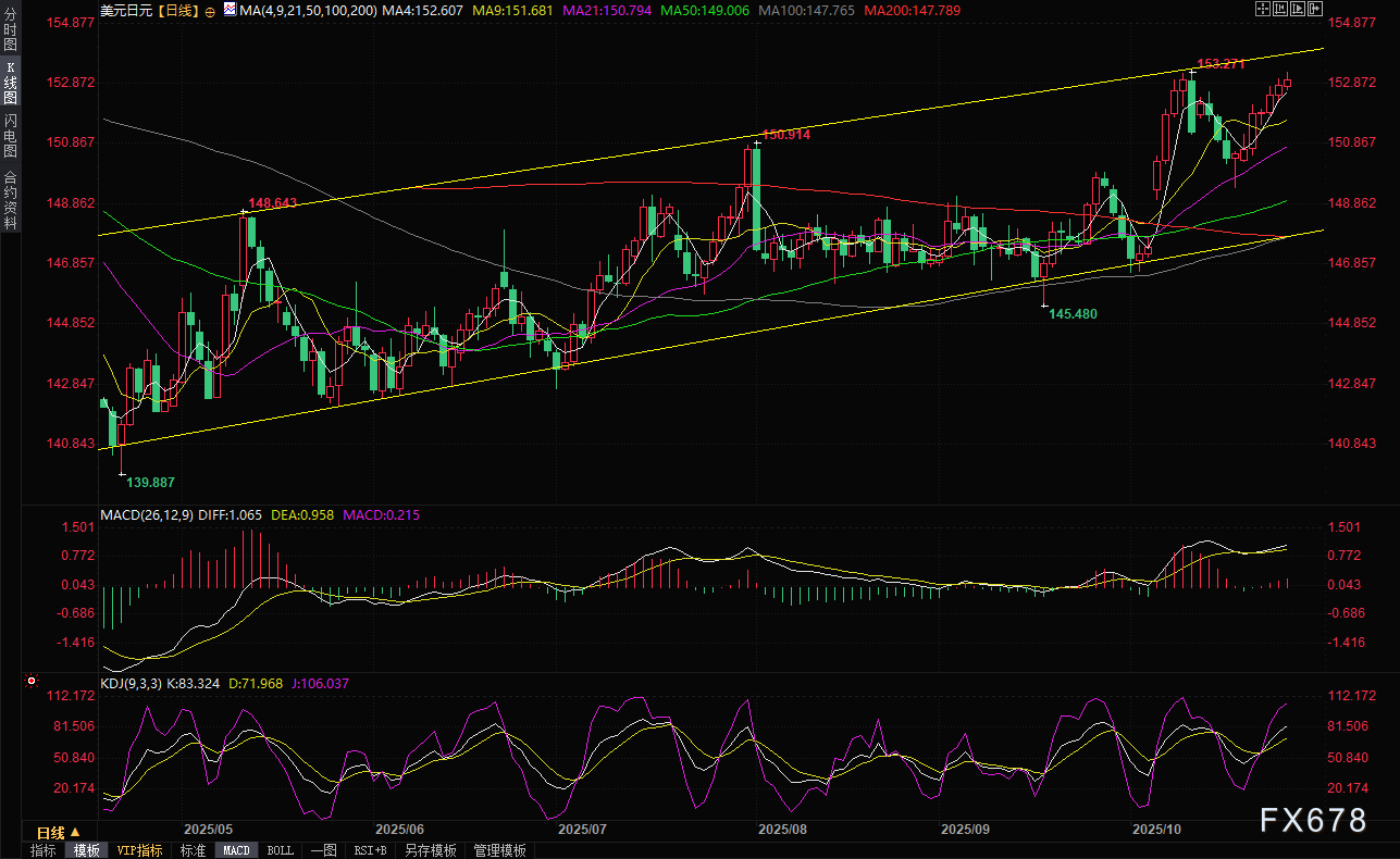日元(JPY)兑美元连续第七天下跌,因市场预期日本新首相高市早苗将推行扩张性支出政策并抵制早期收紧政策。此外,中美贸易紧张局势缓和的迹象也削弱了避险日元的需求,推动美元/日元在周一(10月27日)亚洲时段升至两周多高点,最高触及153.25,接近10月10日创下的近八个月高点153.27;目前小幅回落至153.05附近。 ![]() 周一早些时候发布的数据显示,日本9月服务业生产者价格指数连续第二个月上升,从8月的2.7%加速至3.0%。日本消费者通胀已连续三年多超过日本央行2%的目标,最新数据支持央行进一步收紧政策的理由,但这对提振日元作用甚微。 日本新首相高市早苗被视为前首相安倍晋三经济政策的继承者,以支持刺激政策著称。这引发了对日本财政健康的担忧,并为日本央行进一步收紧政策的前景蒙上阴影,从而限制了日元多头激进押注,抑制了进一步上涨。 美国劳工统计局上周五报告显示,9月总体消费者价格指数(CPI)上涨0.3%,年通胀率为3%。剔除食品和能源后,该指数月增0.2%,年率为3%。这一数据低于市场预期,重申了市场对美联储本周晚些时候降息的预期。 交易员还预计12月FOMC政策会议可能再次降息,这未能帮助美元充分利用10月17日从一周低点的良好反弹。此外,日本央行与美联储政策预期的分歧可能为低收益日元提供一定支撑,并在本周关键央行事件前限制美元/日元上行空间。 美联储定于周三为期两天的政策会议结束后宣布决定,随后是周四日本央行的政策更新。这些前景将对美元/日元下一步的走势起到关键作用。 在贸易相关方面,中美高级经济官员周日就潜在贸易协议框架达成一致,将在特朗普总统和中国领导人本周晚些时候会晤时讨论。这有助于缓解对全球两大经济体全面贸易战的担忧,可能削弱日元的避险地位。 美元/日元突破153.25-153.30阻力位可能加速上涨 从技术角度看,若持续买入突破153.25-153.30区域(即本月早些时候触及的2月以来最高水平),将为美元/日元多头提供新的触发点。 鉴于日线图上的震荡指标持续获得正面动能且尚未进入超买区域,价格可能进一步瞄准154.00整数关口,动能可能进一步延伸至154.50中期阻力位,进而达到154.75-154.80区域和155.00心理关口。 另一方面,亚洲时段低点152.65区域可能作为即时支撑位,若跌破该水平,美元/日元可能滑向152.25中间支撑位,进而达到152.00关口。若明确跌破后者,可能否定看涨前景并引发技术性卖盘,为进一步跌向151.10-151.00支撑位铺平道路。 ![]() 北京时间14:13,美元兑日元现报153.05/06。 |
