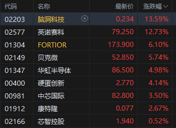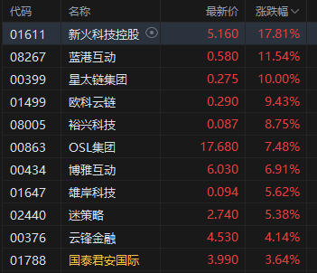 加密货币概念股普涨,新火科技控股涨超17%。10月27日,比特币升破115000美元,日内涨3.35%。其他主流加密货币均出现上涨行情,其中,以太坊价格突破4200美元,日内涨超7%。