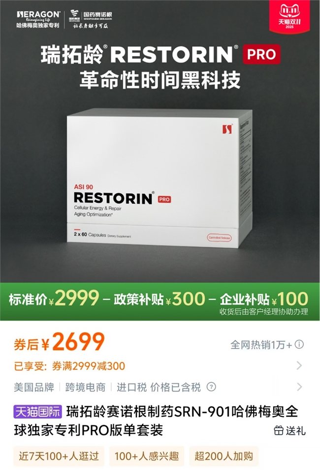 从去年起,一款由国药与原研药企赛诺根(Seragon)合资引进的口服衰老抑制剂瑞拓龄(Restorin)登录国药官方电商平台国药大集、京东、天猫等境内电商平台。作为赛诺根、哈佛、梅奥联合研发的革命性衰老干预产品,吸引众多消费者,特别是高净值人群的密切关注。 瑞拓龄单套按120粒为单位售卖,售价约2000元,按照官方建议每日4至6粒服用剂量计算,月度成本可达2000-3000元。仅天猫单个电商平台,瑞拓龄的累计销量就已超过一万,体现出当下人们对于科学可靠的健康延寿产品的迫切需求。