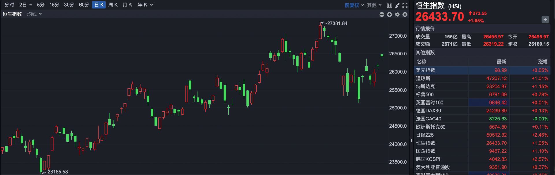 每经记者|曾子建 每经编辑|袁东 今日(10月27日),港股市场全线大反攻。 截至收盘,恒指报收于26433.70点,上涨273.55点,涨幅1.05%。