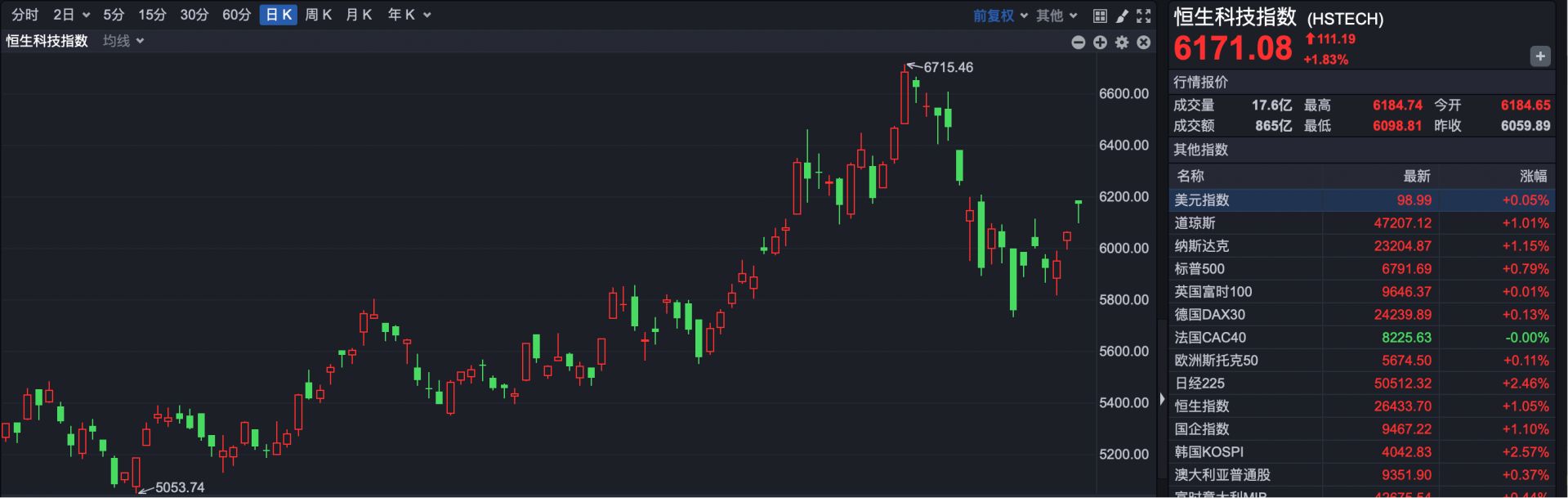 恒生科技指数报收于6171.0点,上涨111.19点,涨幅1.83%。
