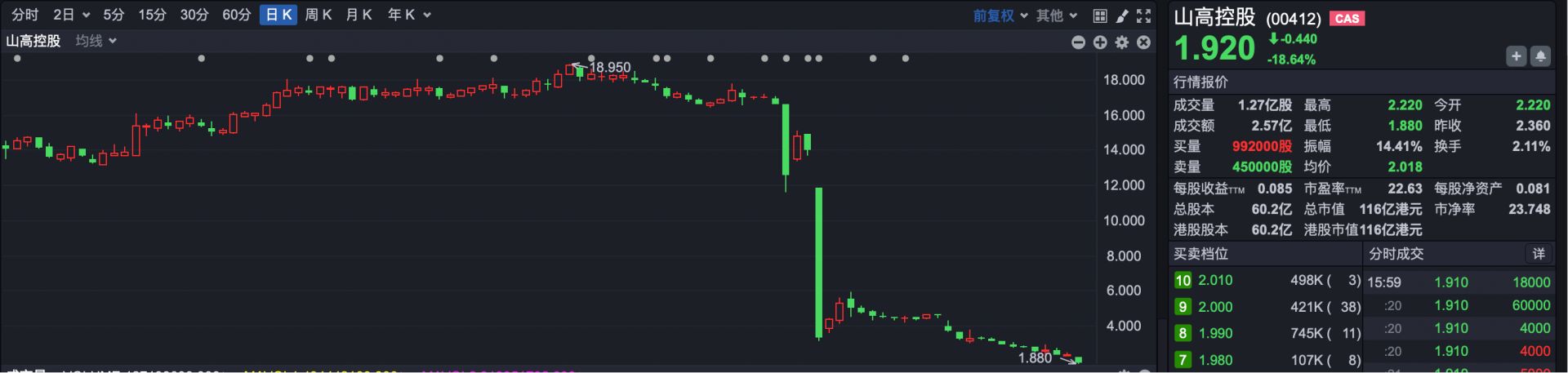 焦点公司方面,山高控股(00412.HK)大跌超18%,股价报1.92港元。10月以来,山高控股累计跌幅超56%,而在9月,该公司累计跌幅更是高达74.79%。今年内,山高控股最高股价一度达到18.95港元。 消息面,深交所公告,因恒生综合中型股指数实施成分股调整,根据《深圳证券交易所深港通业务实施办法》的有关规定,港股通标的证券名单发生调整,调出山高控股,自2025年10月27日起生效。