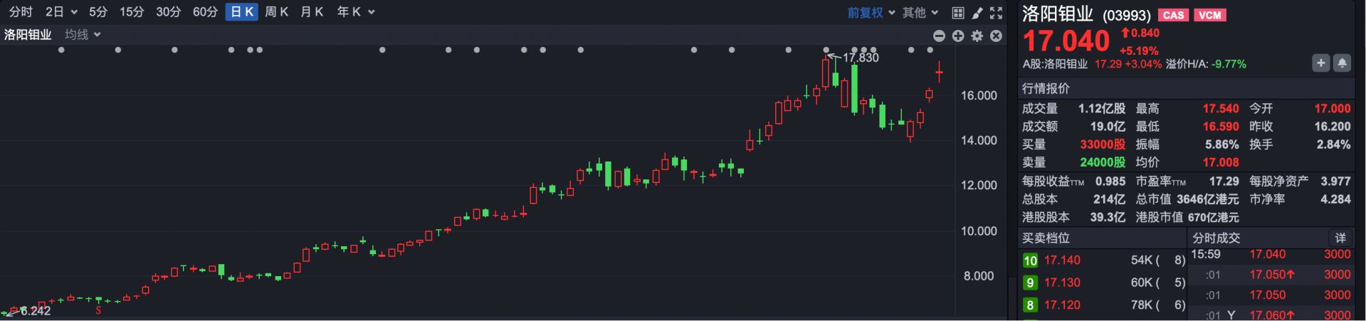 山高控股是山东高速集团重要的境外投融资和新兴产业控股平台,主营业务涵盖产业投资及牌照金融服务。 焦点板块方面,有色金属板块继续走强。其中,洛阳钼业(03993.HK)涨超5%,江西铜业股份(00358.HK)、赣锋锂业(01772.HK)涨超4%,中国宏桥(01378.HK)、五矿资源(01208.HK)涨超3%,金力永磁(06680.HK)、天齐锂业(09696.HK)涨超2%。