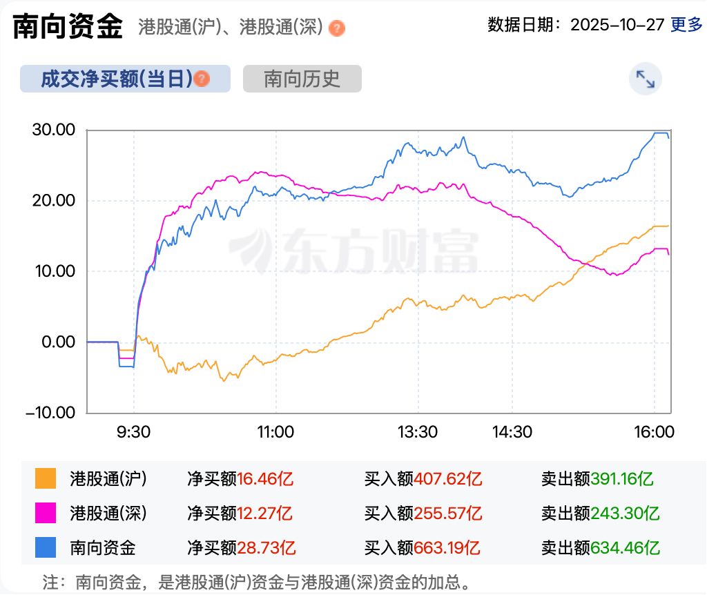 中资券商股活跃,兴证国际涨超8%,国泰君安国际涨超3%,中金公司涨超2%,申万宏源香港涨超1%。多家机构指出,券商板块当前仍是“相对低估+业绩同比高增”的稀缺资产。开源证券认为,上市券商三季报有望超预期,投行、衍生品和公募业务将接续改善,头部券商ROE具备扩张潜力。 其他方面,盘面上,科网股涨多跌少,百度涨超6%,阿里巴巴涨超3%,京东、腾讯涨超2%,美团、快手涨超1%,小米集团逆势小幅回落;加密货币概念股走强,新火科技控股涨超17%。 资金方面,南向资金表现相对谨慎。截至收盘,南向资金净买入港股金额超28亿港元。