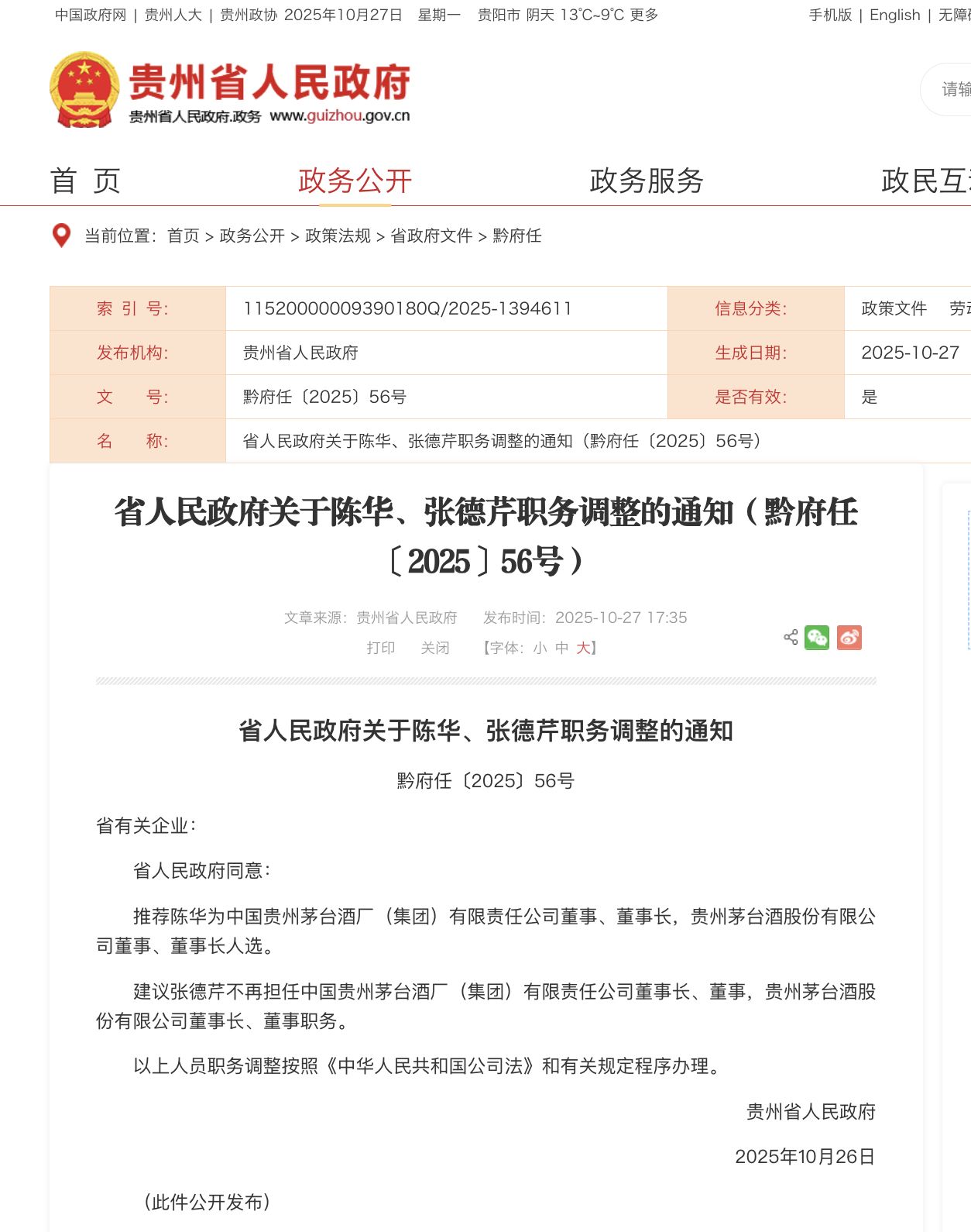 每经编辑|黄胜 10月27日晚,贵州茅台(600519.SH)公告称,公司董事长张德芹因工作调整,申请辞去公司董事长、董事职务及董事会下设专门委员会相应职务,辞职自辞职报告送达董事会时生效。张德芹在任职期间为公司发展作出积极贡献,公司将尽快召开会议选举新董事长。