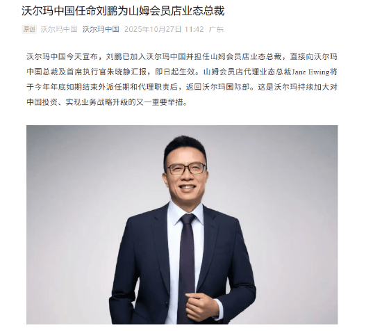 沃尔玛中国10月27日宣布,阿里巴巴原副总裁刘鹏已加入沃尔玛中国并担任山姆会员店业态总裁,直接向沃尔玛中国总裁及首席执行官朱晓静汇报。